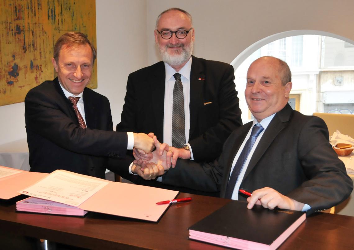 Patrick Liébus, Président de la CAPEB, Paul Duphil, Secrétaire général de l’OPPBTP et Jean-Jacques Chatelain, Trésorier de l’IRIS-ST signent aujourd’hui le renouvellement de leur partenariat initié en 2009 en faveur de la santé et la sécurité au travail, orienté autour de 4 objectifs :