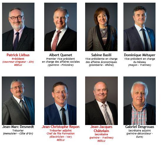 Patrick Liébus a été réélu au poste de Président, par 25 voix sur les 27 exprimées¸ il entame donc son troisième et dernier mandat de Président confédéral. Jean-Christophe Repon a été réélu au poste de Trésorier- adjoint, entamant ainsi son second mandat à ce poste. Enfin, Jean-Jacques Châtelain, administrateur depuis 2005 et Secrétaire depuis 2014, a été réélu au même poste, après avoir été réélu par l’Assemblée générale de Strasbourg à la présidence de l’UNA Peinture-Vitrerie-Revêtements pour un nouveau mandat.