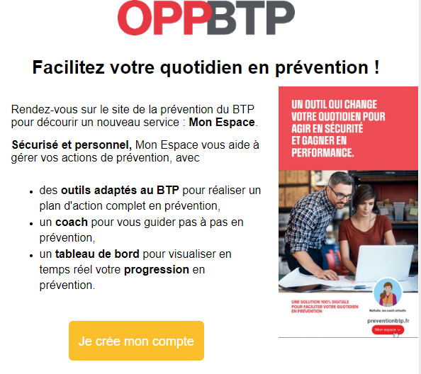 Deux ans après avoir remanié son sitewww.preventionbtp.fr, l’OPPBTP fait encore évoluer son service aux entreprises à travers un nouvel espace : « Mon espace prévention ». Celui-ci dispose d’une collection d’outils en ligne adaptés au BTP et permet de gérer toutes les actions de prévention de façon simple et ludique. Un tableau de bord permet de suivre sa progression.