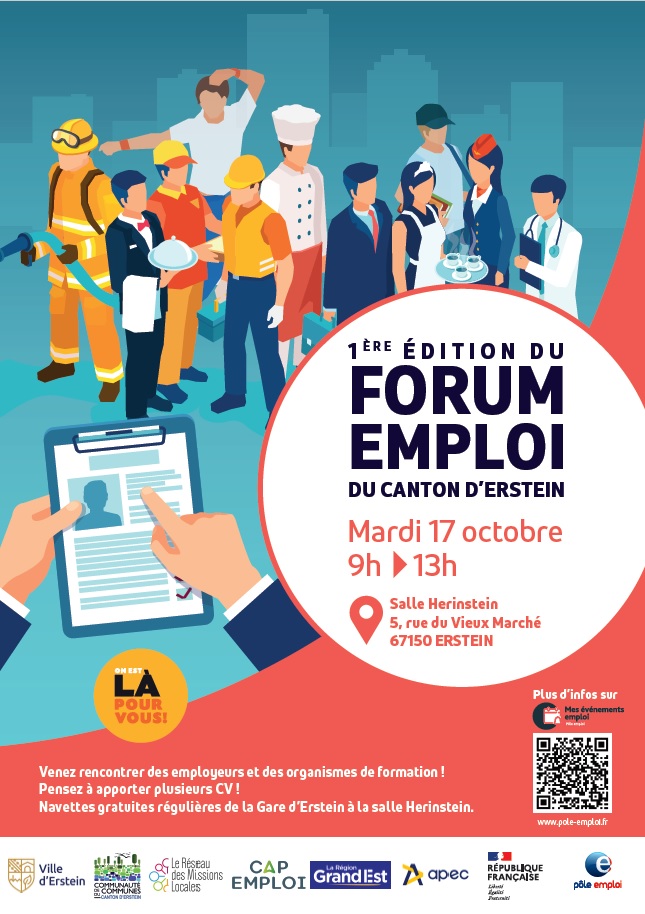 La 1ère édition du Forum Emploi du canton d'ERSTEIN aura lieu le mardi 17 octobre 2023 de 9h à 13h à la salle Herinstein au 5 rue du Vieux Marché à ERSTEIN.