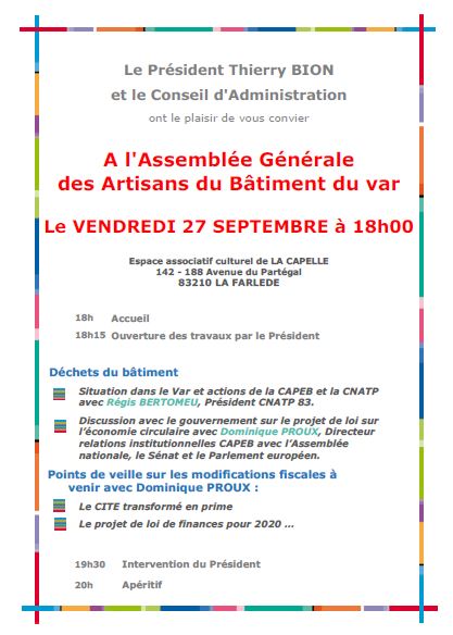 2019-09-27 18:00:00 Assemblée Générale CAPEB VAR Réservée uniquement aux artisans du bâtiment: https://bit.ly/2y790Ls