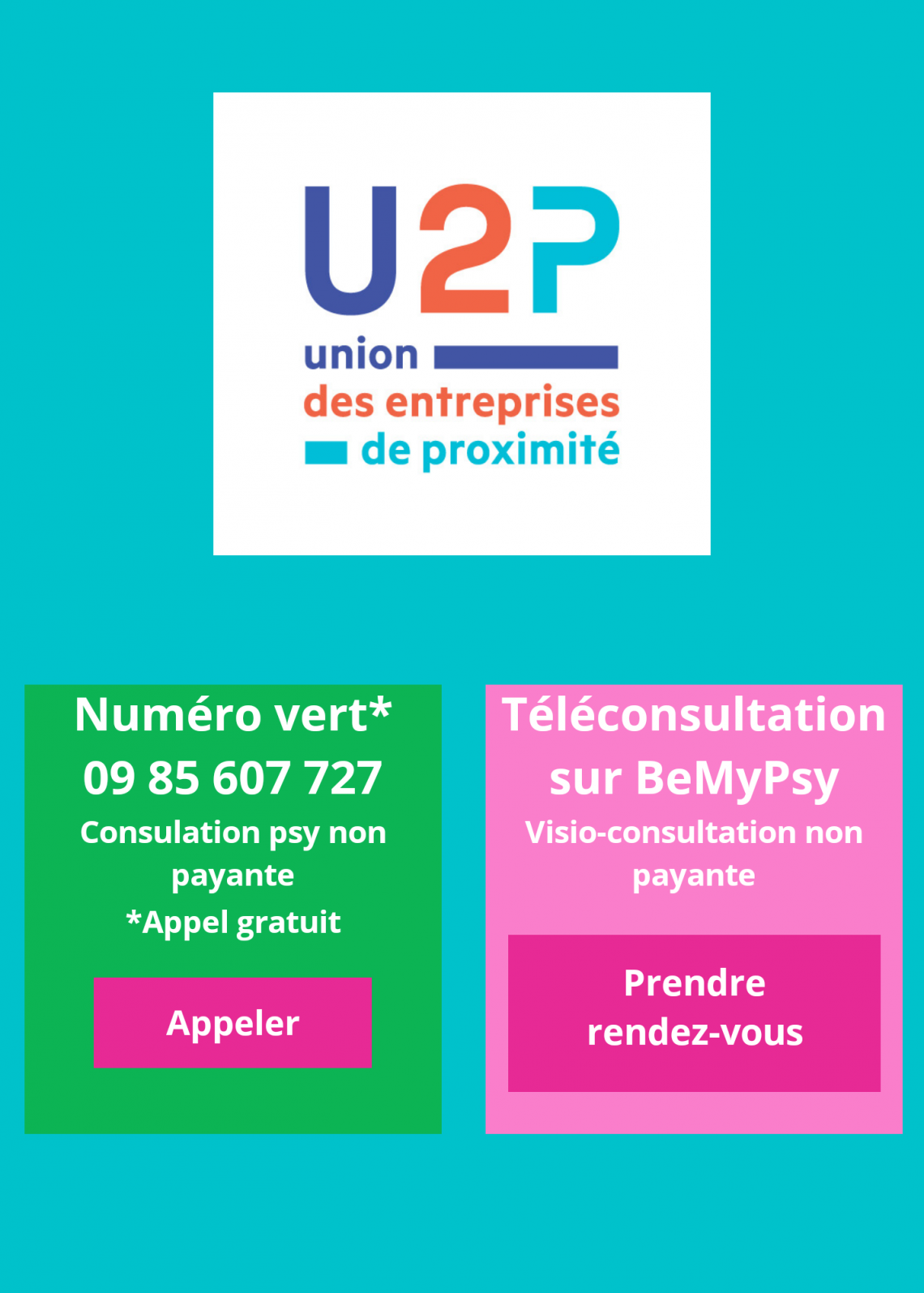 Aussi, en collaboration avec l’UNAPL, le Syndicat National des Psychologues (SNP) et le Groupement des praticiens de la Psychologie – Psychanalyse – psychothérapie (Psy’G), l'U2P a décidé d’aller plus loin dans l’accompagnement de ses ressortissants.L'U2P a décidé de mettre en place un numéro vert, pris en charge en totalité par l’U2P, à l’attention de l’ensemble des chefs entreprise de proximité, en s’appuyant sur la plateforme développée par Bemypsy.com dont vous trouverez le lien ci-joint https://bemypsy.com/.