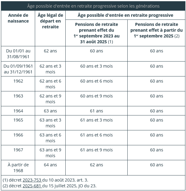 L'âge d’ouverture du droit à la retraite progressive est donc fixé à 60 ans pour les pensions prenant effet à compter du 1er septembre 2025. Sont concernés les assurés relevant du régime général, régimes spéciaux, les salariés et non-salariés agricoles et les professions libérales et avocats.