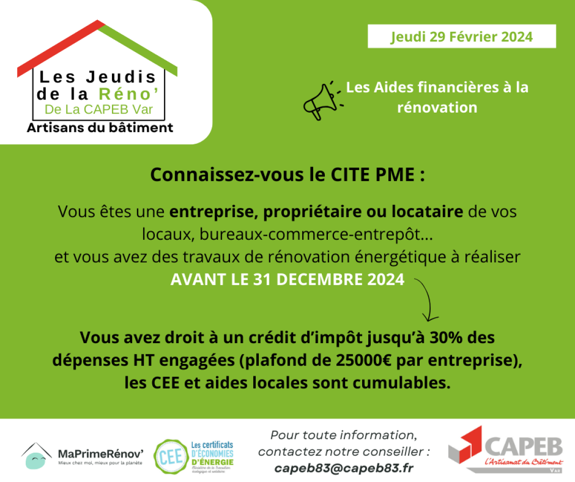 Pour plus d'infos, contactez Eric Lemarchand au 04.94.14.72.62 ou par mail capeb83@capeb83.fr
