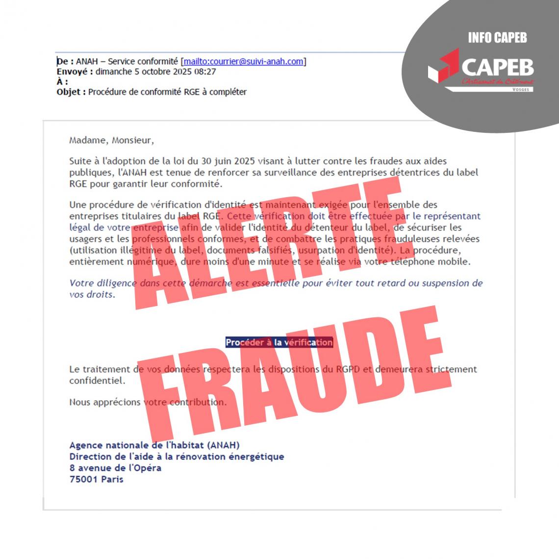 Un courriel frauduleux, vise à usurper l’identité de l’Agence nationale de l’habitat (ANAH). Son but : vous inciter à cliquer sur un lien malveillant sous prétexte de vérifier l’identité de l’entreprise labellisée RGE, sous peine de suspension.