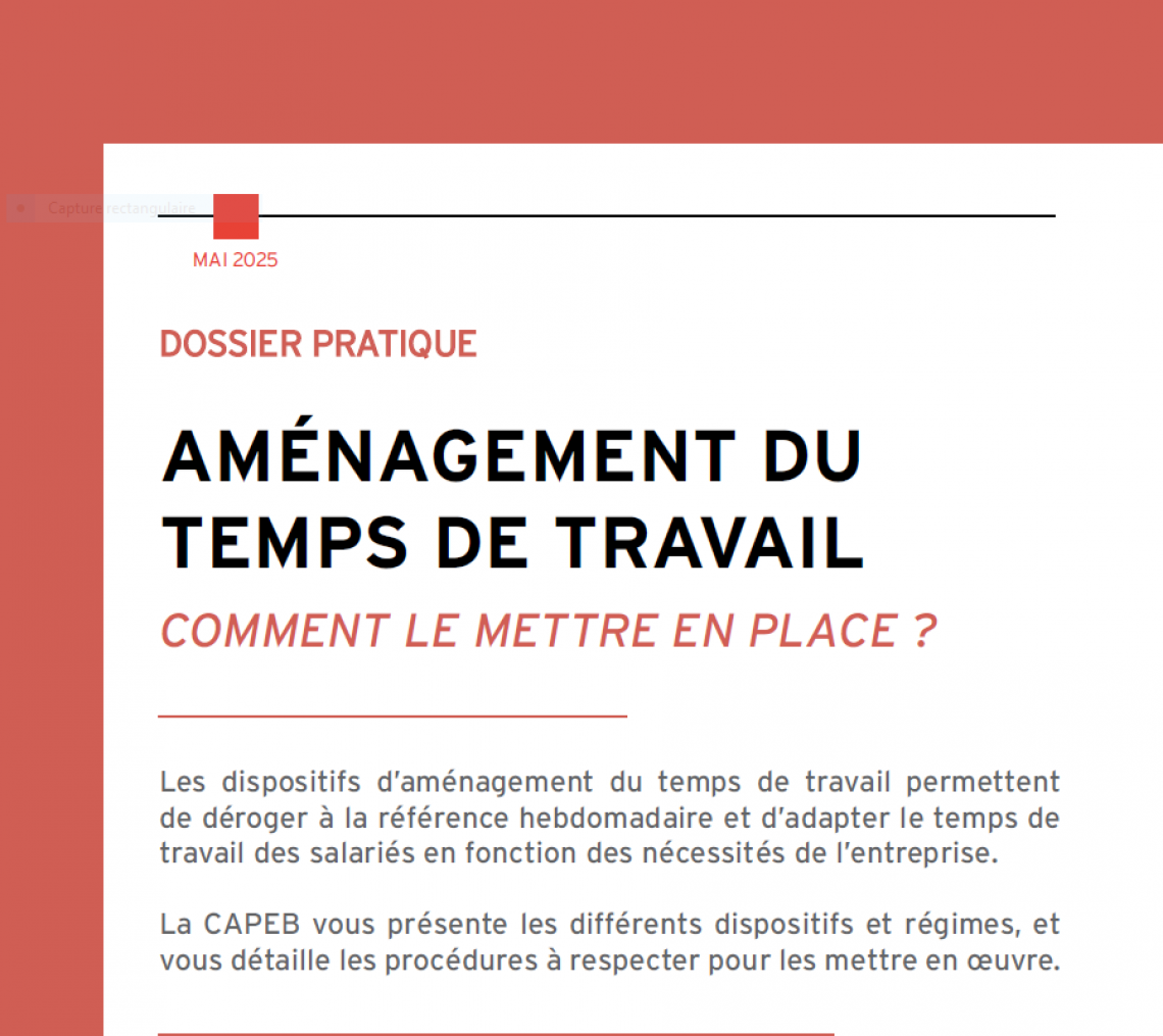 Les dispositifs d’aménagement du temps de travail permettent de déroger à la référence hebdomadaire et d’adapter le temps de travail des salariés en fonction des nécessités de l’entreprise. La CAPEB présente les différents dispositifs et régimes, et détaille les procédures à respecter pour les mettre en œuvre dans une infographie téléchargeable par ses adhérents, à qui elle propose également un accompagnement.