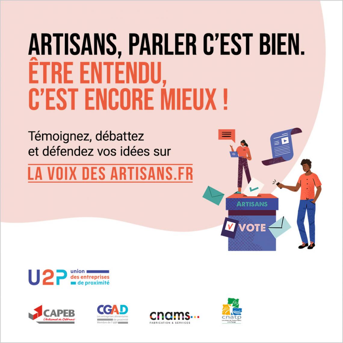 Cette année, l’U2P et l’ensemble de ses organisations membres (CAPEB, CGAD, CNAMS etCNATP) se réunissent sous les listes intitulées « La Voix des Artisans ». Elles ont pour objectif de défendre les entreprises artisanales et de faire valoir toutes les attentes des artisans.