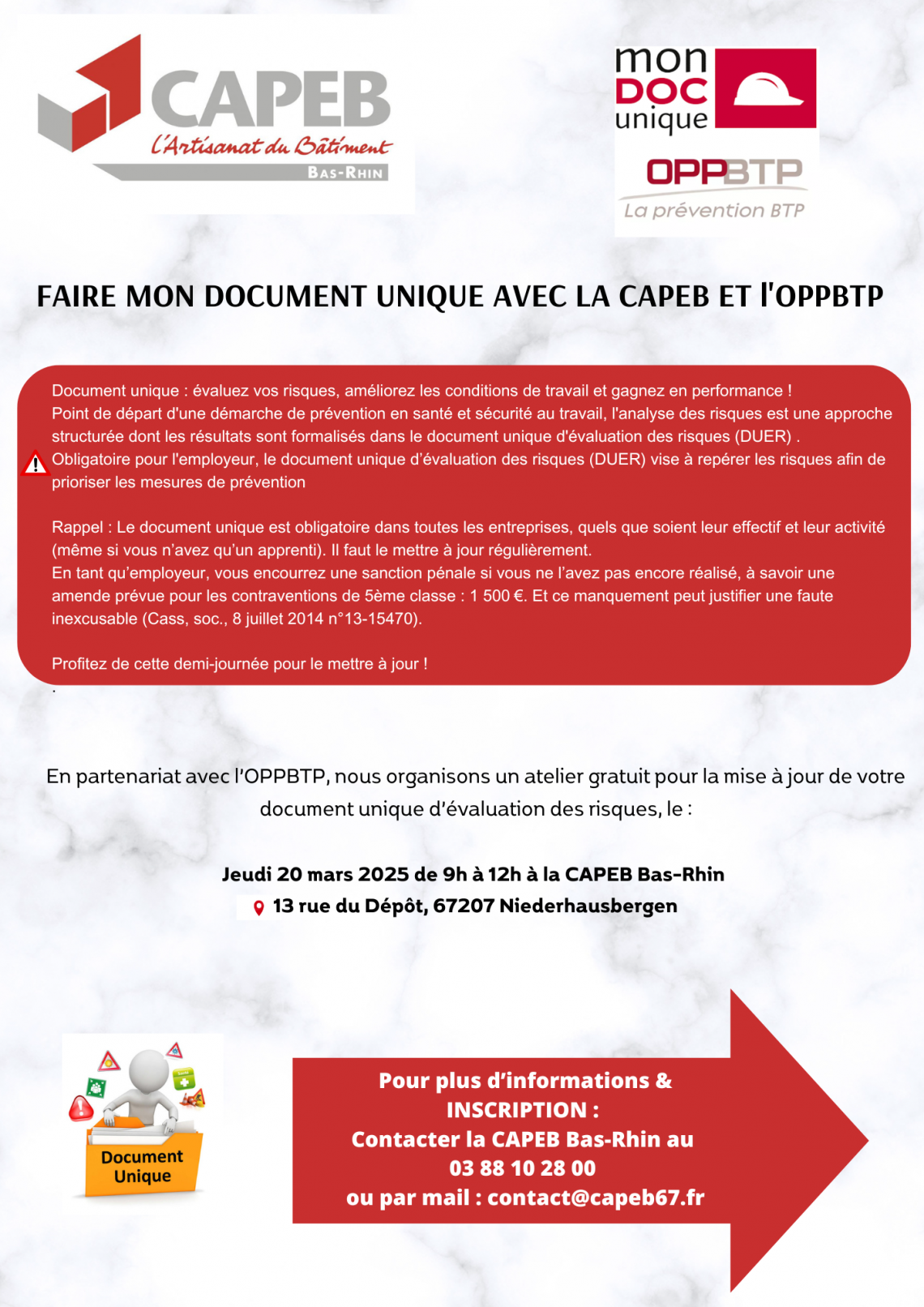 Atelier Gratuit Document Unique - Jeudi 20 mars à la CAPEB du Bas-Rhin