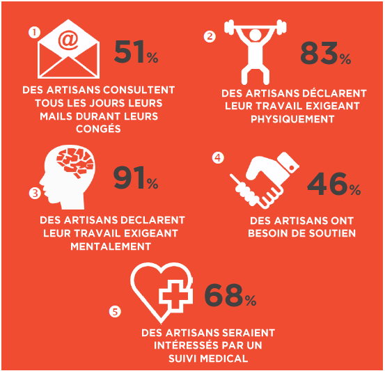 Les principales tendances observées au cours de ces 5 dernières années sont invariables voire se dégradent : un rythme de travail intense, une exigence mentale en constante augmentation, un stress présent et des cas d’épuisement professionnels recensés et en augmentation, un suivi médical quasi inexistant car non obligatoire, des difficultés économiques spécifiques aux très petites entreprises