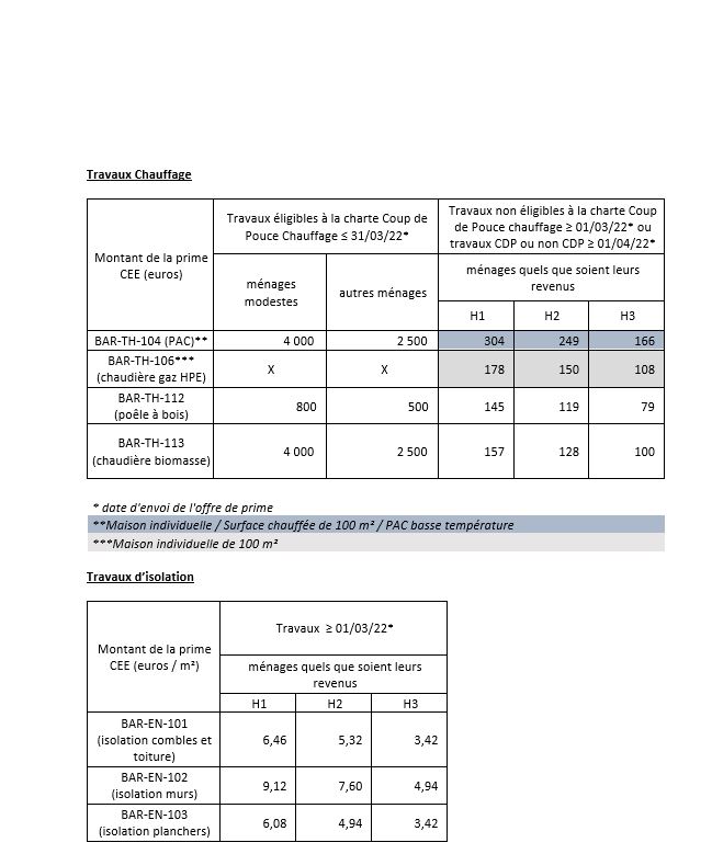 A compter du 01/03/2022, le montant des primes CEE pour l’ensemble des offres BUTAGAZ-CAPEB passe à 3,80 euros/MWhc pour les opérations non Coup de Pouce (les opérations éligibles à la charte « Coup de Pouce Chauffage » restent à 5,50 euros/MWhc).