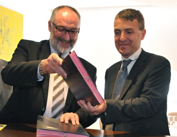 Patrick Liébus, Président de la Confédération de l’Artisanat et des Petites Entreprises du Bâtiment et Hervé de Maistre, Directeur Général Adjoint d’ISOVER, officialisent le 26 juillet la collaboration entre la CAPEB, via sa filiale Béranger Développement, et ISOVER.