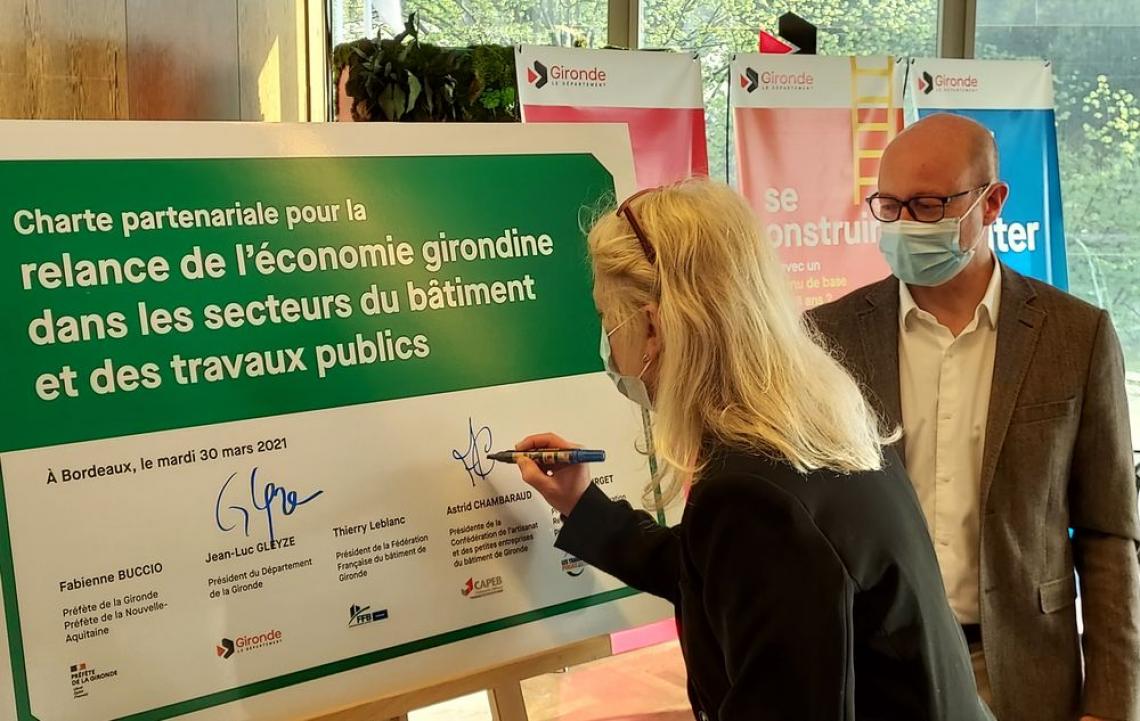 Mardi 27 Mars 2021 à l’Hôtel du Département, Astrid CHAMBARAUD, Présidente de la CAPEB Gironde a signé avec Jean-Luc GLEYZE, Président du Conseil Départemental de la Gironde, la Charte pour la relance de l’économie girondine dans les secteurs du Bâtiment et des TP.
