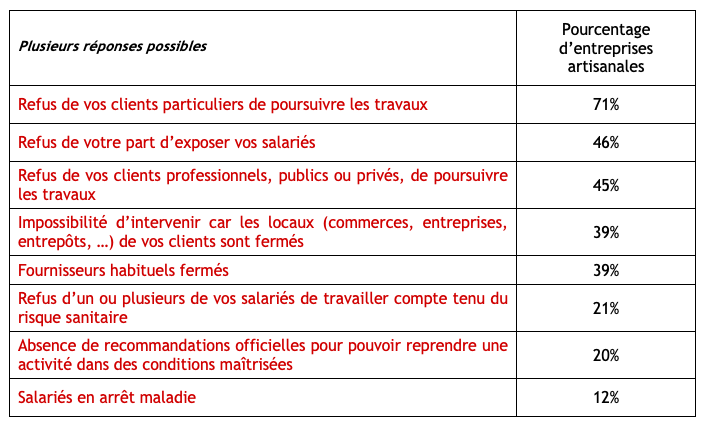Depuis le 17 mars, 80 % des entreprises sont à l’arrêt, 17 % ont maintenu une activité réduite n’exposant pas les salariés aux risques sanitaires et 3 % poursuivent une activité quasi-normale pour les interventions d’urgence. Pour les entreprises du bâtiment, la principale raison de cet arrêt des chantiers s’explique par le refus des clients particuliers (71 %) et des clients professionnels, publics ou privés (45 %) de continuer les travaux. Pour 46% des chefs d’entreprises, la baisse d’activité s’explique également par la volonté de protéger leurs salariés. Enfin, les difficultés