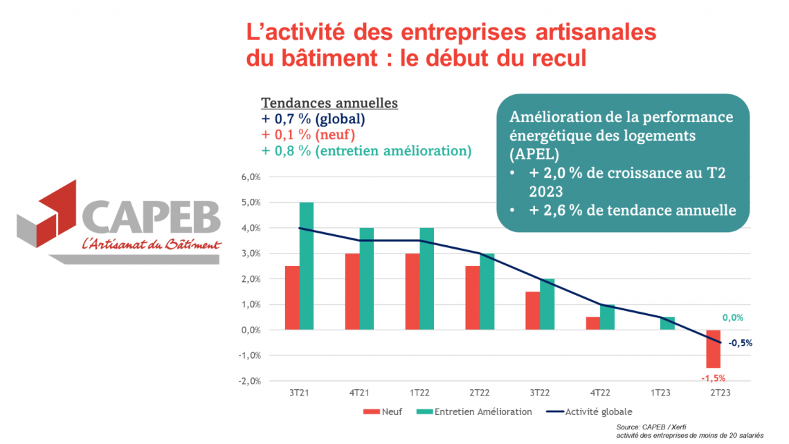- L’activité globale de l’artisanat du bâtiment recule de 0,5 %, un retrait largement tiré par l'activité dans le neuf qui continue à plonger (- 1,5 %).