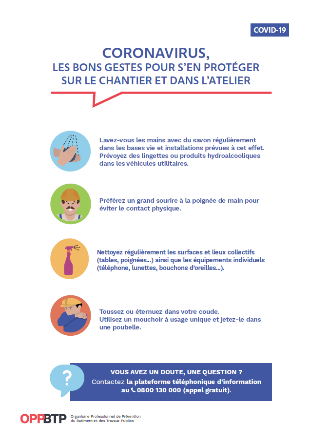 Nous vous conseillons donc d’utiliser l’affiche jointe à ce document pour participer à la diffusion des gestes de base à respecter sur les chantiers et ateliers pour se protéger au mieux du coronavirus, et limiter ainsi les risques de contamination.