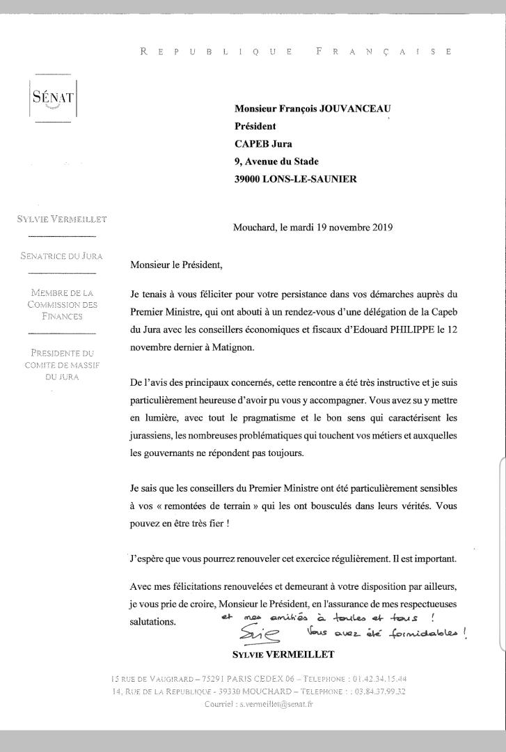 Après le RDV de la CAPEB Jura l'hôtel MATIGNON avec le Conseiller économique du Premier Ministre, la Sénatrice, Sylvie VERMEILLET nous a écrit