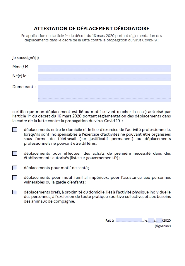 Le 16 mars 2020, le Président de la République a décidé de prendre des mesures pour réduire les contacts et déplacements au strict minimum sur l’ensemble du territoire à compter du mardi 17 mars à 12h00, pour quinze jours minimum :