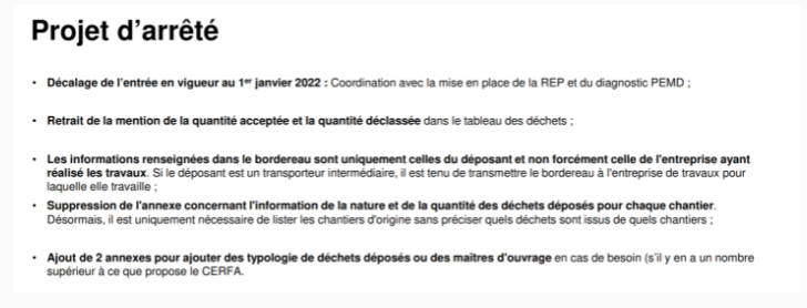 - Sur le contenu du bordereau : concernant l’origine des déchets, l’ensemble des chantiers d’origine devront être mentionnés : ne pas renseigner ces éléments dérogerait à la volonté du législateur. En revanche, il n’est pas demandé de détailler précisément quelle quantité de déchets a été générée pour chaque chantier : seule la quantité totale déposée est demandée.