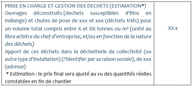 Dès lors que le client souhaite garder la charge de l’enlèvement des déchets, cela devra bien faire l’objet d’une précision de sa part pour dégager la responsabilité de l’entreprise sur ce point.On pourrait procéder comme suit : l’entreprise propose un devis avec la ligne complète pour les déchets ; le client modifie la ligne déchets en mentionnant, de sa main, qu’il conserve les déchets. L’entreprise valide cette modification avec coup de tampon et signature. . Si l’entreprise intègre dans le devis initial la prise en charge des déchet par le client, elle n’en reste pas moins tenue d’indiquer la ligne complète et mentionnera que le client souhaite assurer la gestion des déchets. Dans ce cas, la gestion des déchets n’est pas facturée, ou l’est partiellement (car c’est bien l’entreprise qui déconstruit et trie), mais sur la facture, il doit être clairement inscrit que la gestion et l’enlèvement des déchets sont non facturés (ou partiellement facturés) car pris en charge par le client à sa demande.
