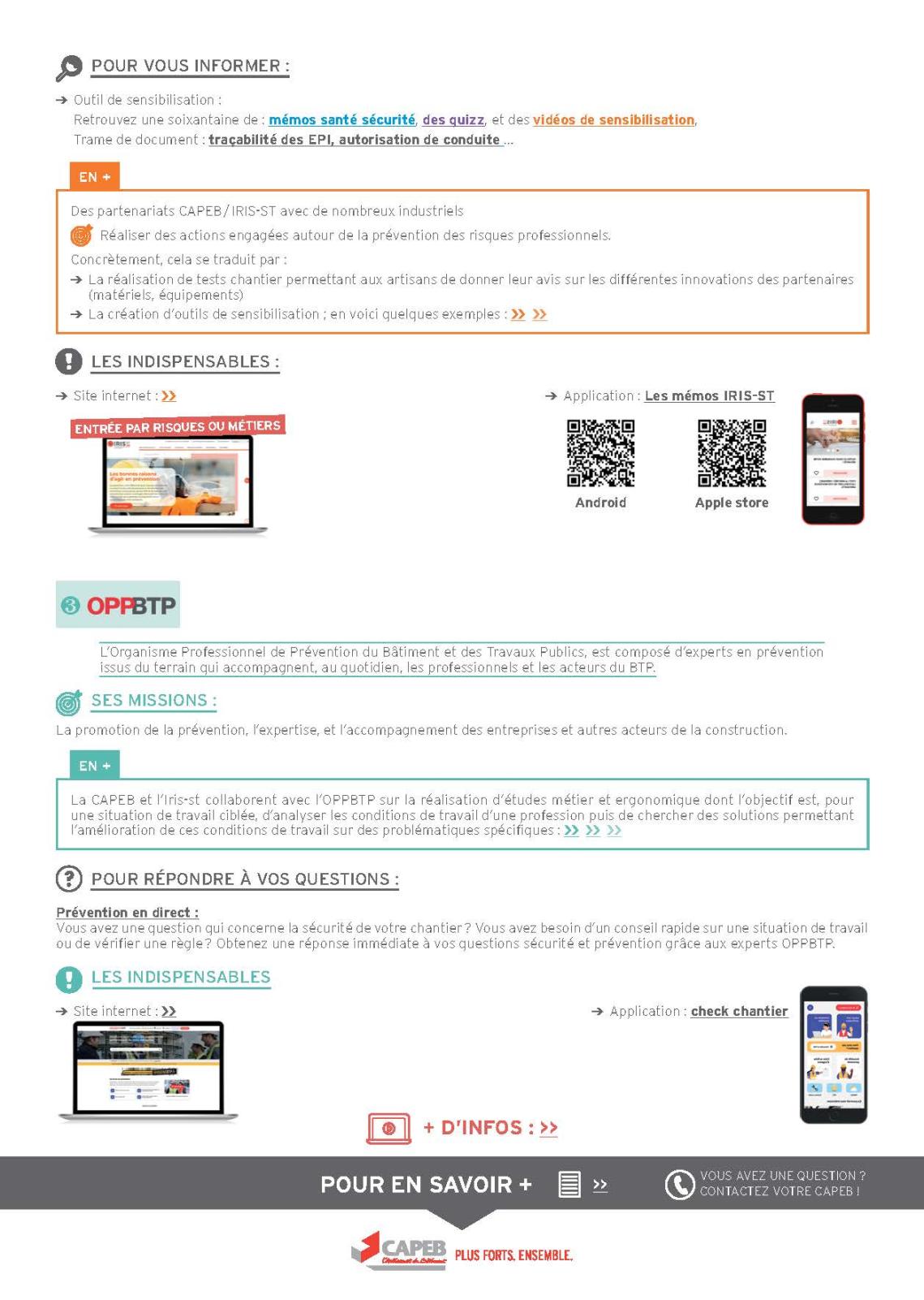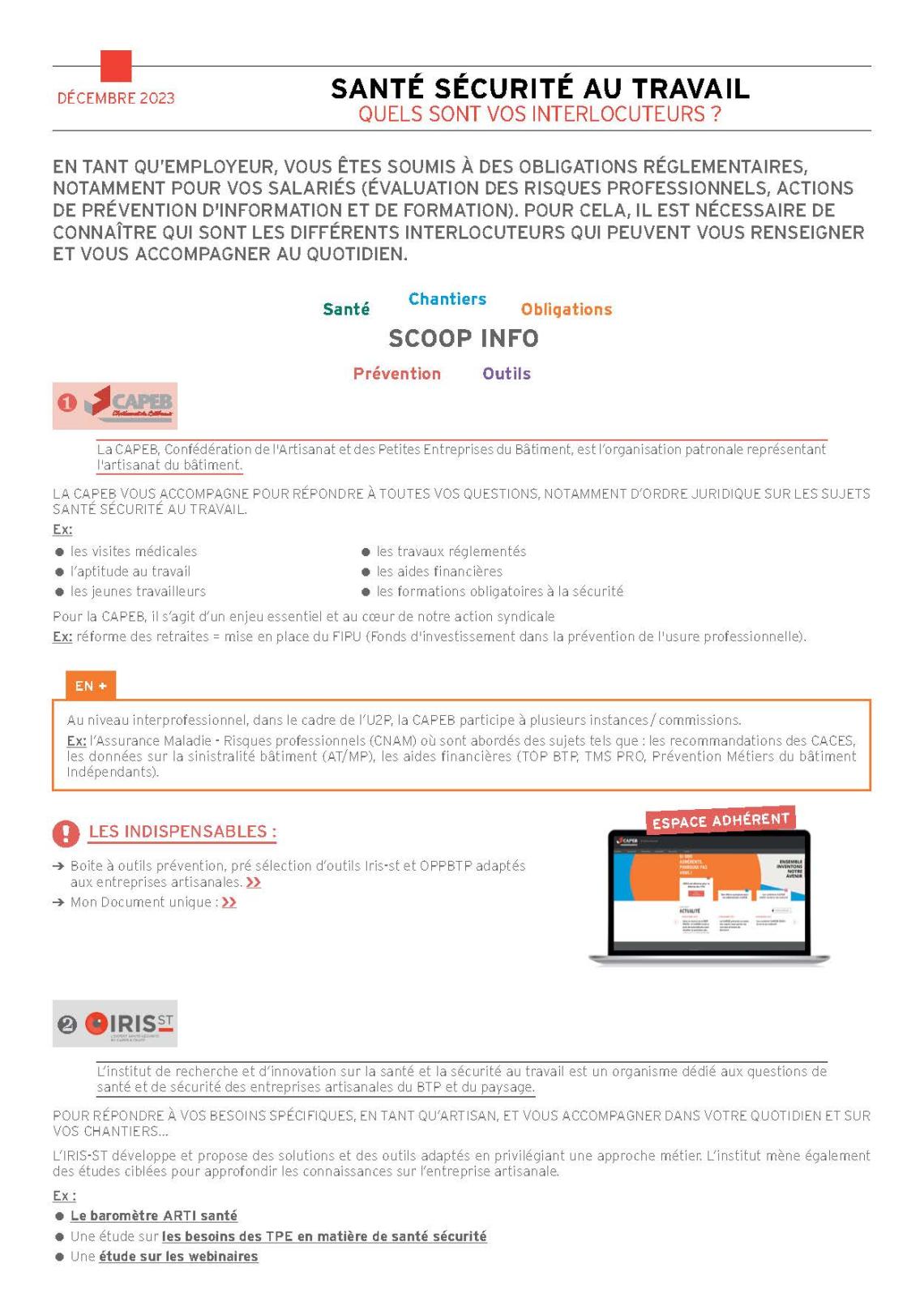 La CAPEB, l’IRIS ST et l’OPPBTP se sont alliés pour accompagner les entreprises artisanales qui n’ont pas de service dédié en interne. Ce sont généralement les chefs des petites entreprises et/ou leurs conjoints qui sont chargés de faire respecter les règles de sécurité et de prévention auprès de leurs salariés. Celles-ci étant nombreuses et la plupart du temps obligatoires, SCOOP infos est l’outil informatif indispensable pour avoir clés en main toutes les notions nécessaires pour la bonne organisation de votre entreprise.