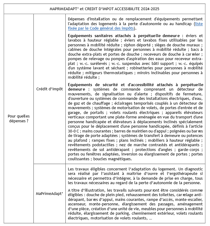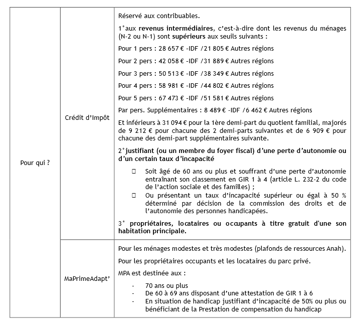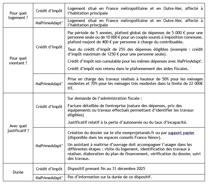 Alors qu’un dispositif d’aides dit « MaPrimAdapt’ » voit le jour en 2024, le crédit d’impôt en faveur de l’adaptation des logements à la dépendance est prorogé, pour les seuls ménages intermédiaires, pour 2024 et 2025 avec des aménagements. Le tableau ci-dessous vous présente ces deux dispositifs.