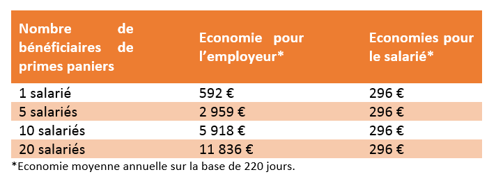 En remplaçant une prime panier par un Chèque Déjeuner, même une petite entreprise réalisera de très fortes économies, tout comme ses salariés. On peut parler d’un système gagnant– gagnant. Plus la taille de l’entreprise est importante, plus les économies de cotisations sociales et fiscales sont impactantes.