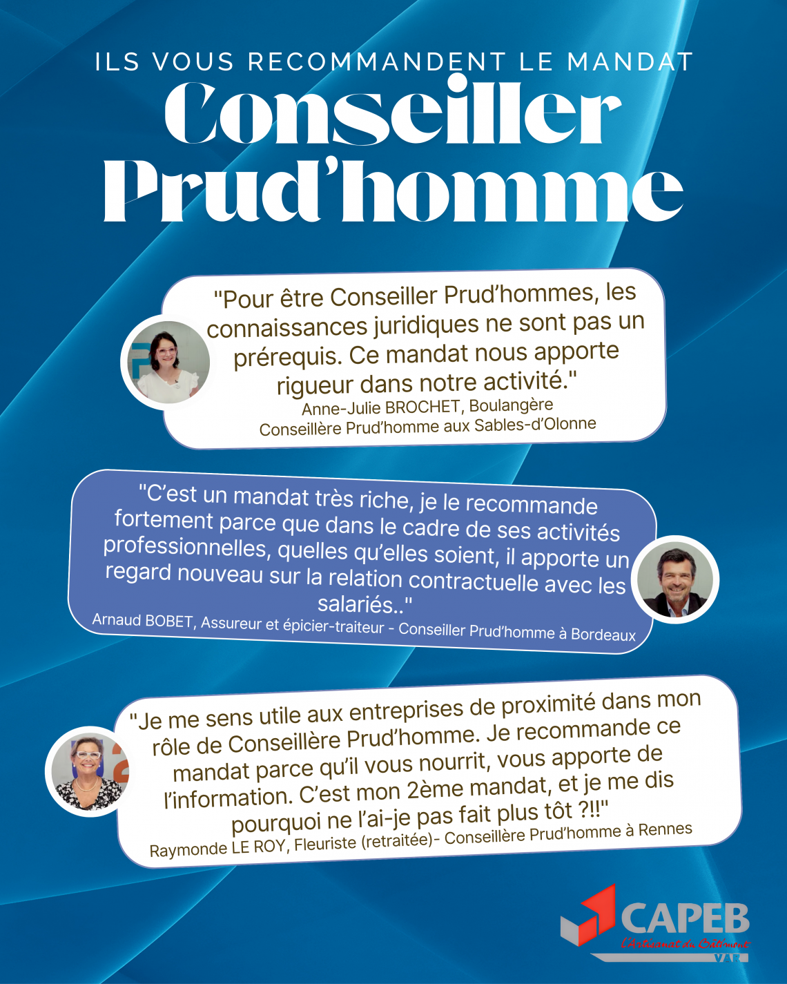 Un rôle accessible à tous les artisans ! Pas besoin d’être juriste ! Le mandat de Conseiller Prud’homme est ouvert à tous chefs d’entreprise .