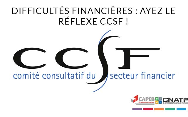 Dès lors que votre entreprise rencontrerait une difficulté pour honorer une échéance fiscale ou sociale, et à la condition que vous soyez à jour de vos obligations déclaratives et de paiement de la part salariale des cotisations sociales, vous disposez d'un accès au CCSF (Comité Consultatif du Secteur Financier).