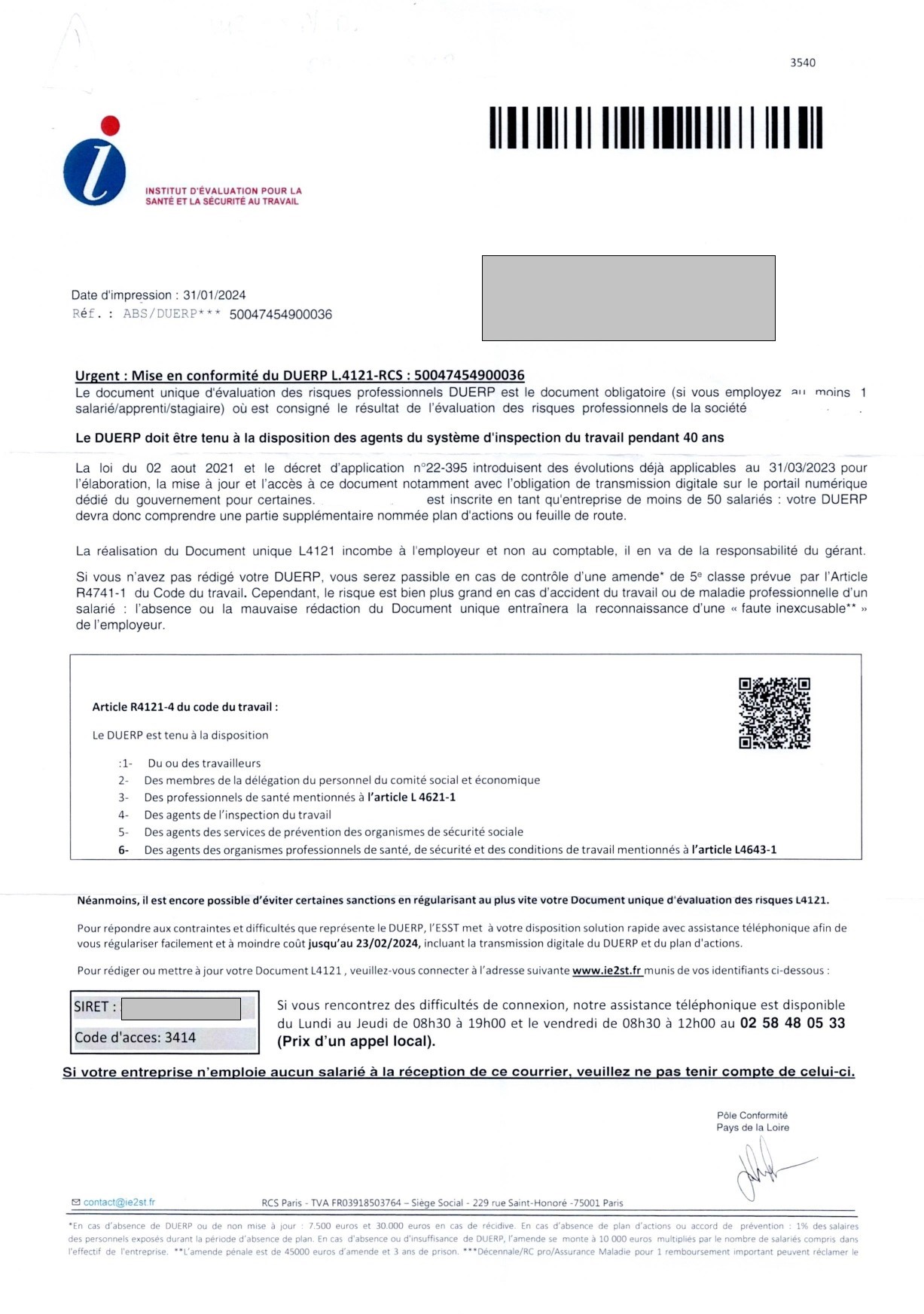 Des entreprises ont reçu, un courrier personnalisé émanant de l’IESST - Institut d'Évaluation pour la Santé et la Sécurité au Travail (75001 PARIS) intitulé URGENT : MISE EN CONFORMITE DU DUERP