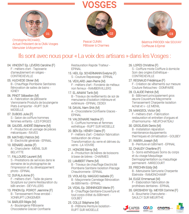 La liste « La Voix des Artisans » est composée d’artisans issus de tous les métiers de l’artisanat, qui se mettront au service exclusif des artisans, à la différence des listes des organisations concurrentes (fédérations du MEDEF et de la CPME) qui défendent des entreprises de plus grande taille aux intérêts contraires à ceux des entreprises artisanales.