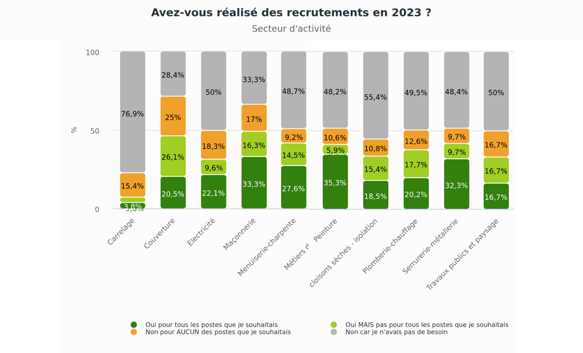 De manière générale, les besoins en recrutement sont en légère baisse (54% des entreprises artisanales du bâtiment souhaitaient recruter en 2023 contre 63% en 2022) et son particulièrement marqués dans les secteurs du carrelage et platerie/isolation.