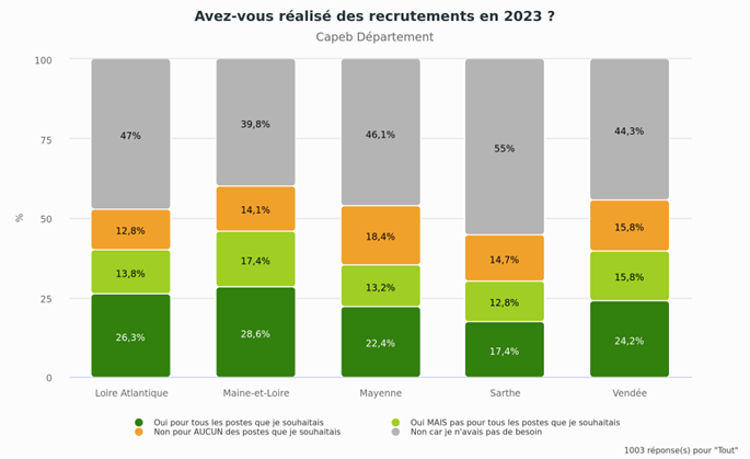 Néanmoins, en termes de ratio besoin / recrutement effectif, plus d’entreprises artisanales du bâtiment ont réussi à recruter (en tout cas sur une partie de leurs postes à pourvoir) : 75% en 2023 versus 68% en 2022. On observe une nette augmentation des postes pourvus en maçonnerie en 2023 par rapport à 2022. Les actions de promotion fonctionnent et doivent perdurer : la CAPEB et les entreprises continuent de se mobiliser.