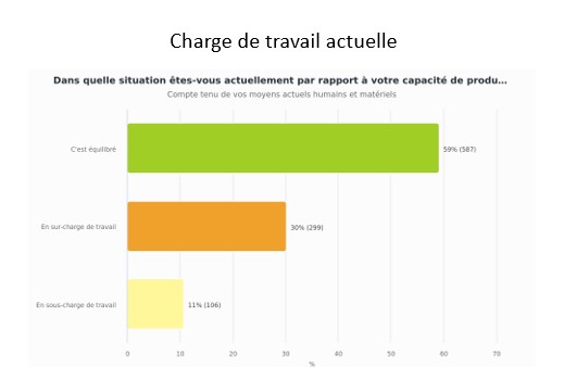 - 30% sont en surcharge de travail (46% en 2023). Les métiers de la couverture (53.4% des entreprises), de la maçonnerie sont les secteurs les plus impactés par une surcharge de travail liée à leur capacité de production actuelle : un constat à mettre en parallèle avec les difficultés de recrutement exprimées par ces deux secteurs.