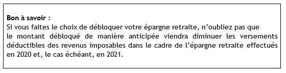 En effet, la troisième loi de finances rectificative pour 2020 du 30 juillet 2020 prévoit que les travailleurs non-salariés peuvent demander le déblocage exceptionnel, dans la limite globale de 8 000 €, de leur épargne retraite.La demande de rachat doit être adressée à l’assureur ou au gestionnaire avant le 31 décembre 2020.