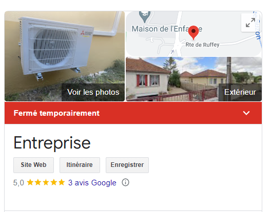 Attention lorsque nous recherchons des entreprises sur internet, il nous arrive de tomber sur ce genre de résultat (voir ci-dessous), vérifiez bien que votre Google business est à jour et ouvert !