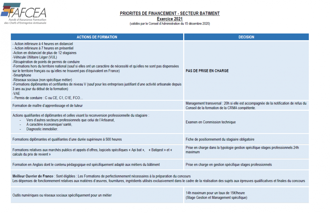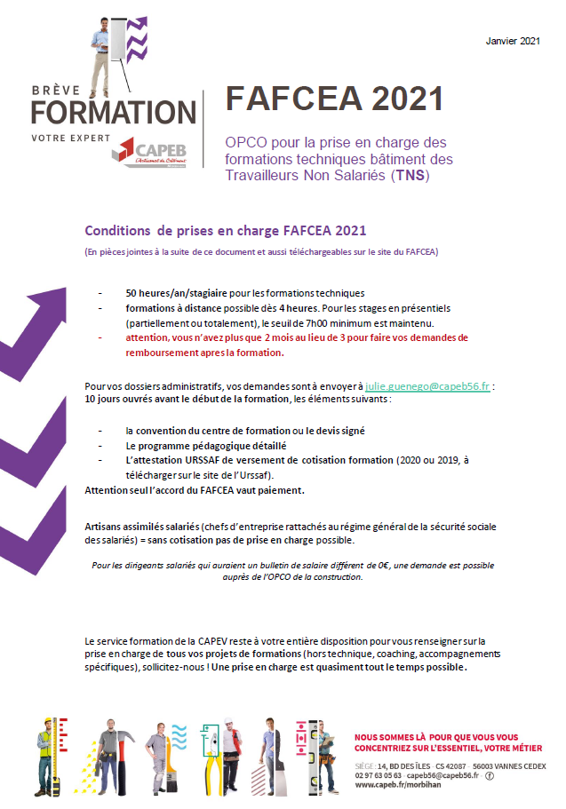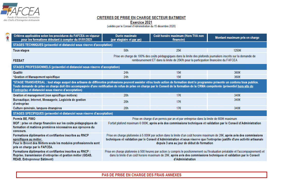 FAFCEA 2021 : conditions de prise en charge OPCO des formations techniques bâtiment des TNS
