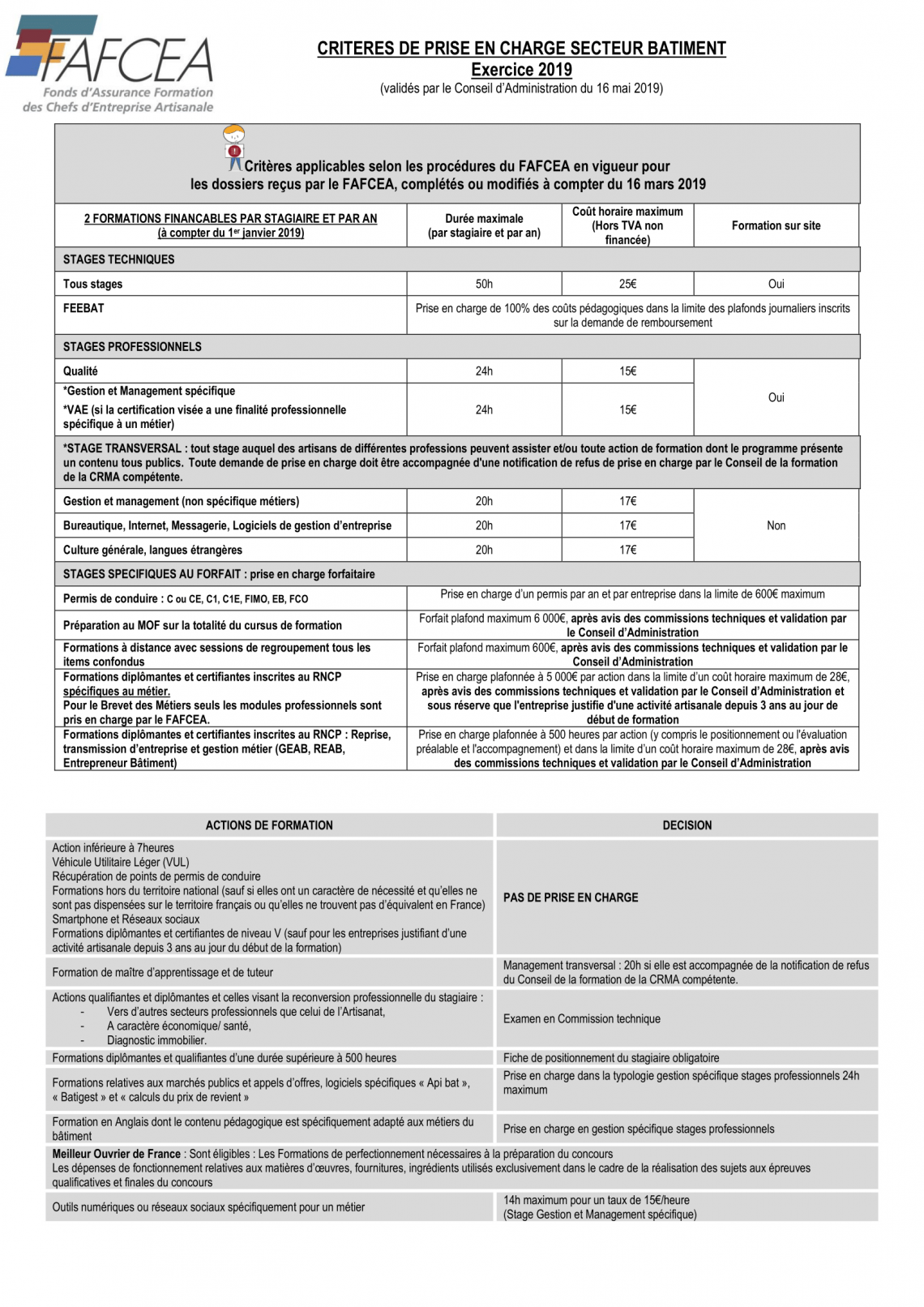 Les dossiers complets et déposés avant le 16 mars bénéficient d'un agrément du FAFCEA sur les anciens critères, c’est-à-dire ceux en vigueur avant le 16 mai 2019. Dans le cas d'un dépassement de nombre de formations (2 par an et par stagiaire) ou de quotas d'heures (50h formations techniques), le FAFCEA financera les formations demandées avant cette date.