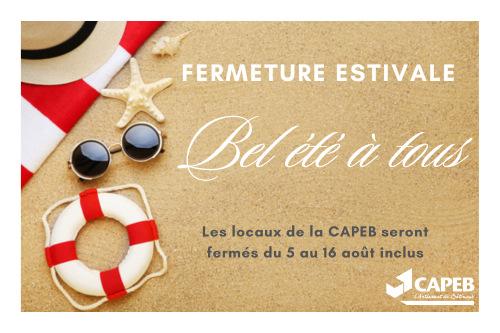 2024-07-23 00:00:00 Fermeture estivale de la CAPEB Maine-et-Loire Les locaux de la CAPEB Maine et Loire sont fermés du 5 au 16 août inclus.
