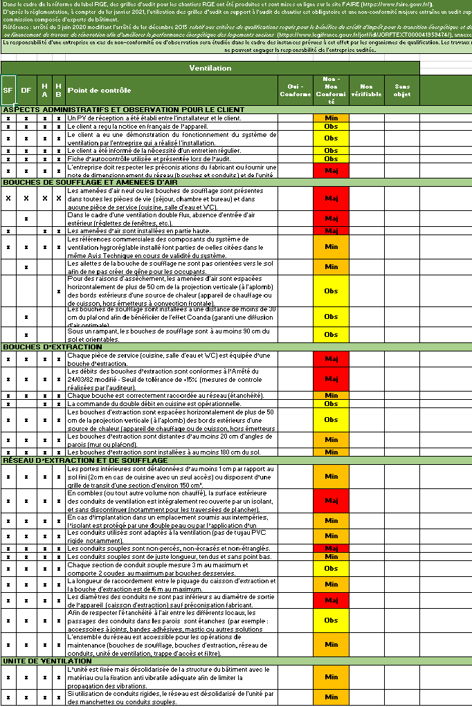 Dans le cadre de la réforme du label RGE, des grilles d'audit pour les chantiers RGE ont été produites. Pour chaque type de travaux une grille des éléments contrôlés est disponible afin que les professionnels RGE soit informés des points de contrôle.