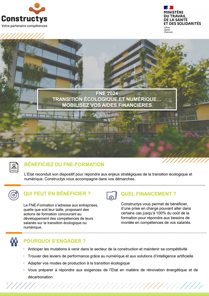 Constructys vous accompagne pour mobiliser le FNE et vous permettre de profiter de ces financements pour :