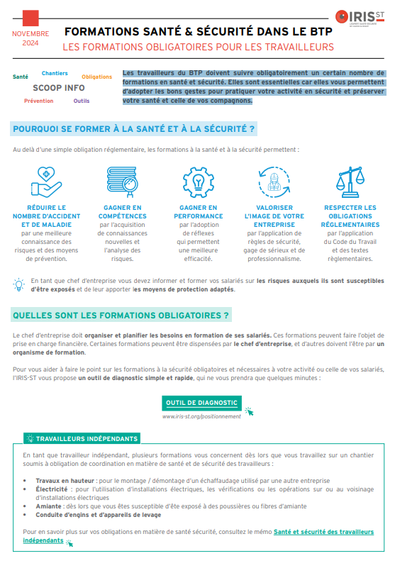 Les travailleurs du BTP doivent suivre obligatoirement un certain nombre de formations en santé et sécurité. Elles sont essentielles car elles vous permettent d’adopter les bons gestes pour pratiquer votre activité en sécurité et préserver votre santé et celle de vos compagnons.