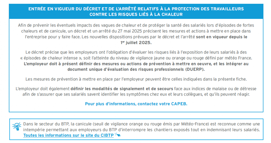 Des températures extérieures élevées peuvent avoir un impact sur l'organisme et entraîner des effets sur la santé. Quelles sont les obligations ? Comment détecter les signaux d’alerte ? Que faire en cas de malaise ? La CAPEB et l’IRIS-ST vous aident à adopter les bonnes pratiques.