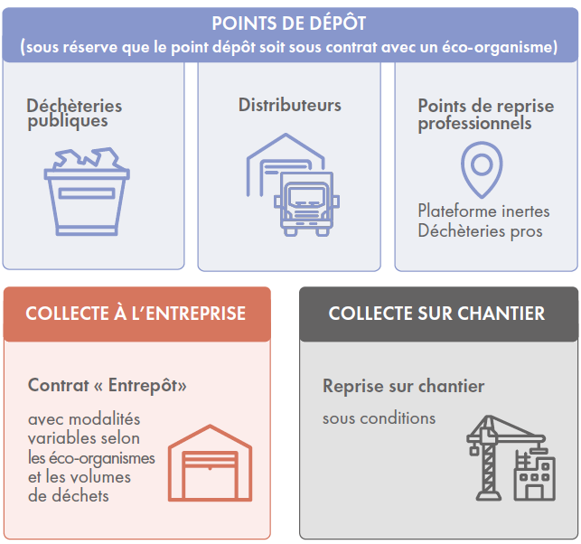 Ce dispositif repose sur deux enjeux majeurs : la collecte d’écocontributions, depuis le 1er mai 2023, et le déploiement progressif, d’ici le 31 décembre 2026, de solutions de reprise des matériaux triés et de réemploi.