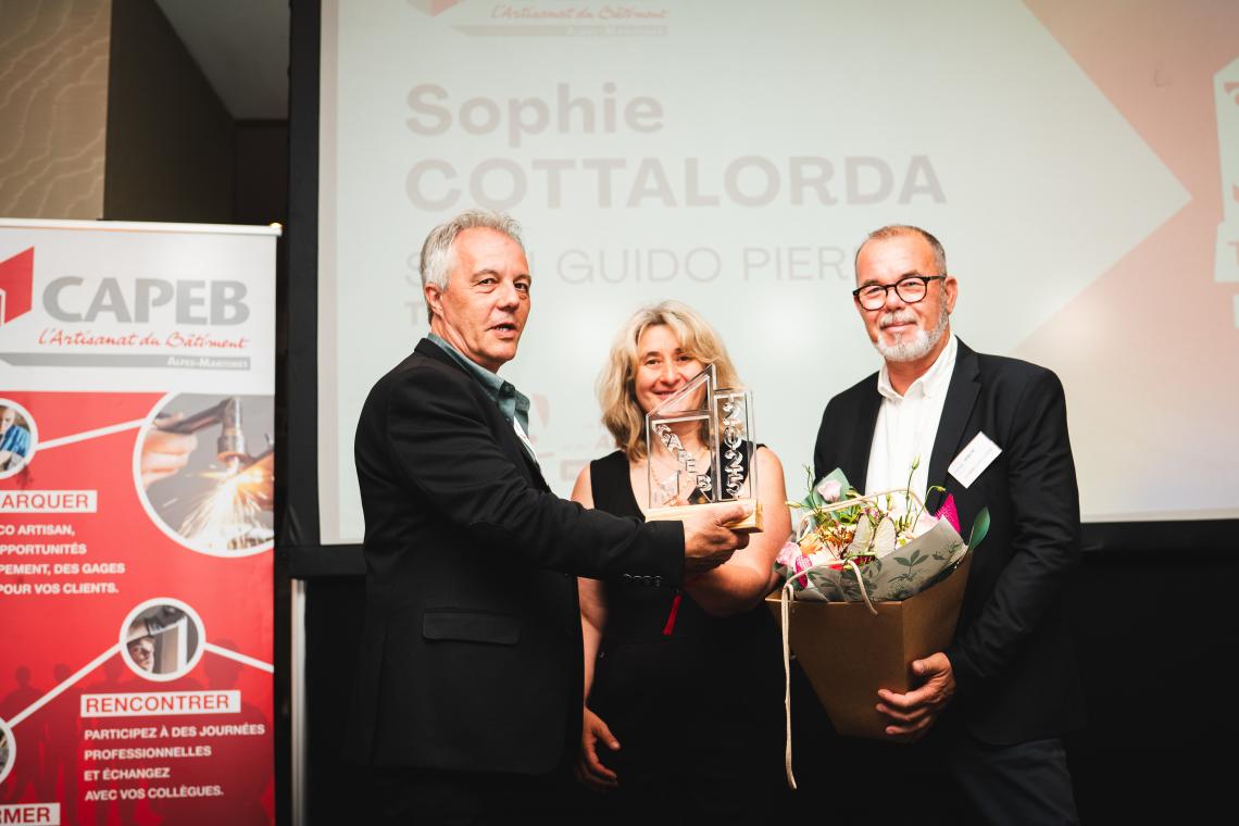 Sophie COTTALORDA (entreprise GUIDO à Tende) .Outre son engagement pour le métier, c’est également celui pour la défense de son territoire que les maçonsde la CAPEB06 ont voulu mettre en exergue au travers de ce trophée.