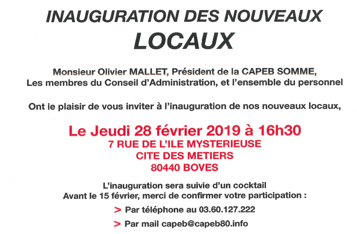 2019-02-28 16:30:00 INAUGURATION DES NOUVEAUX LOCAUX DE VOTRE CAPEB LE JEUDI 28 FEVRIER 2019 A 16H30 DANS LES LOCAUX A LA CITE DES METIERS
