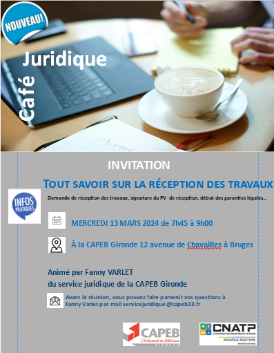 INVITATION CAFE JURIDIQUE A LA CAPEB GIRONDE - 13 MARS 2024 - De 7h45 à 9h00