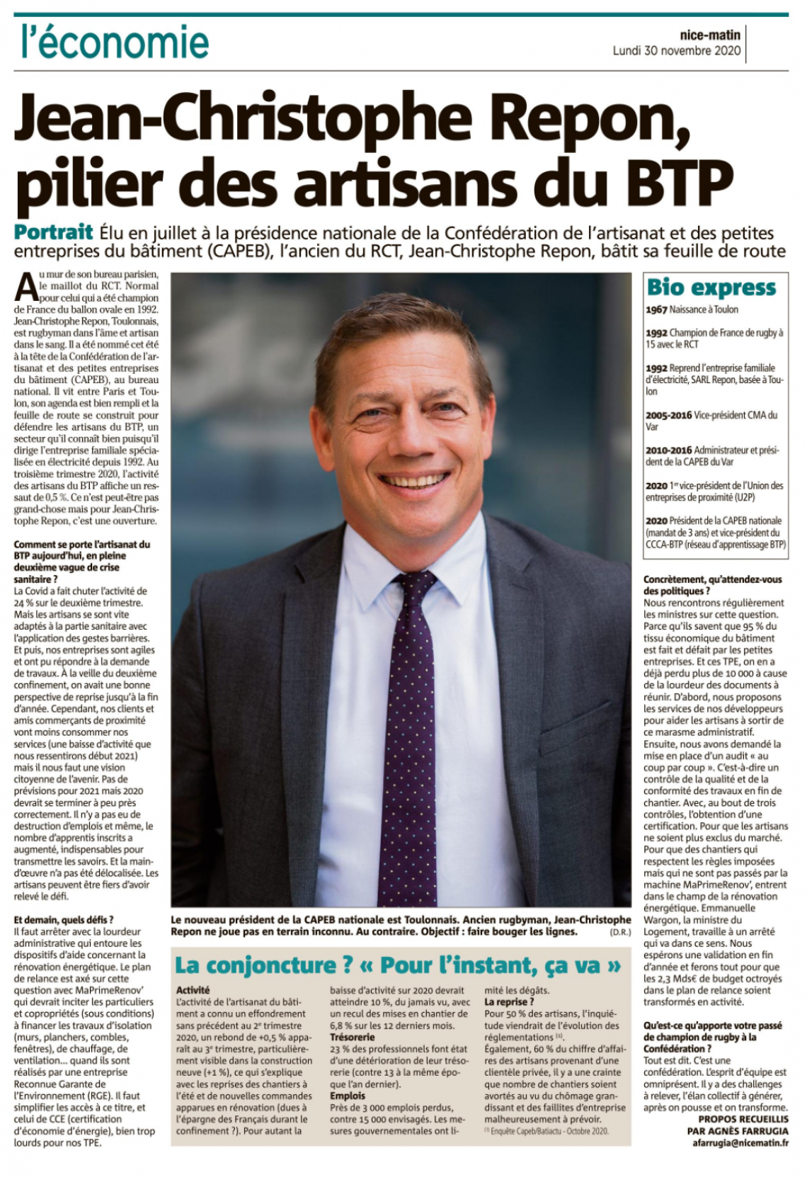 Jean-Christophe Repon, Président de la CAPEB Nationale, à la une de Nice Matin