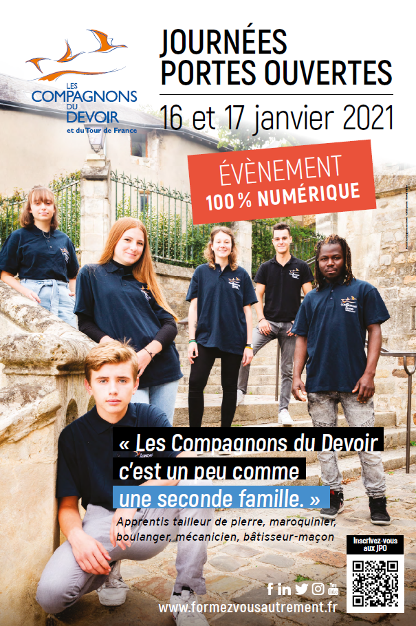 L’objectif de ces Journées Portes Ouvertes est de découvrir le mode de formation original proposé par les Compagnons du Devoir et de prendre connaissance des nombreux métiers proposés par l’association, grâce aux webinaires dispensés en ligne.