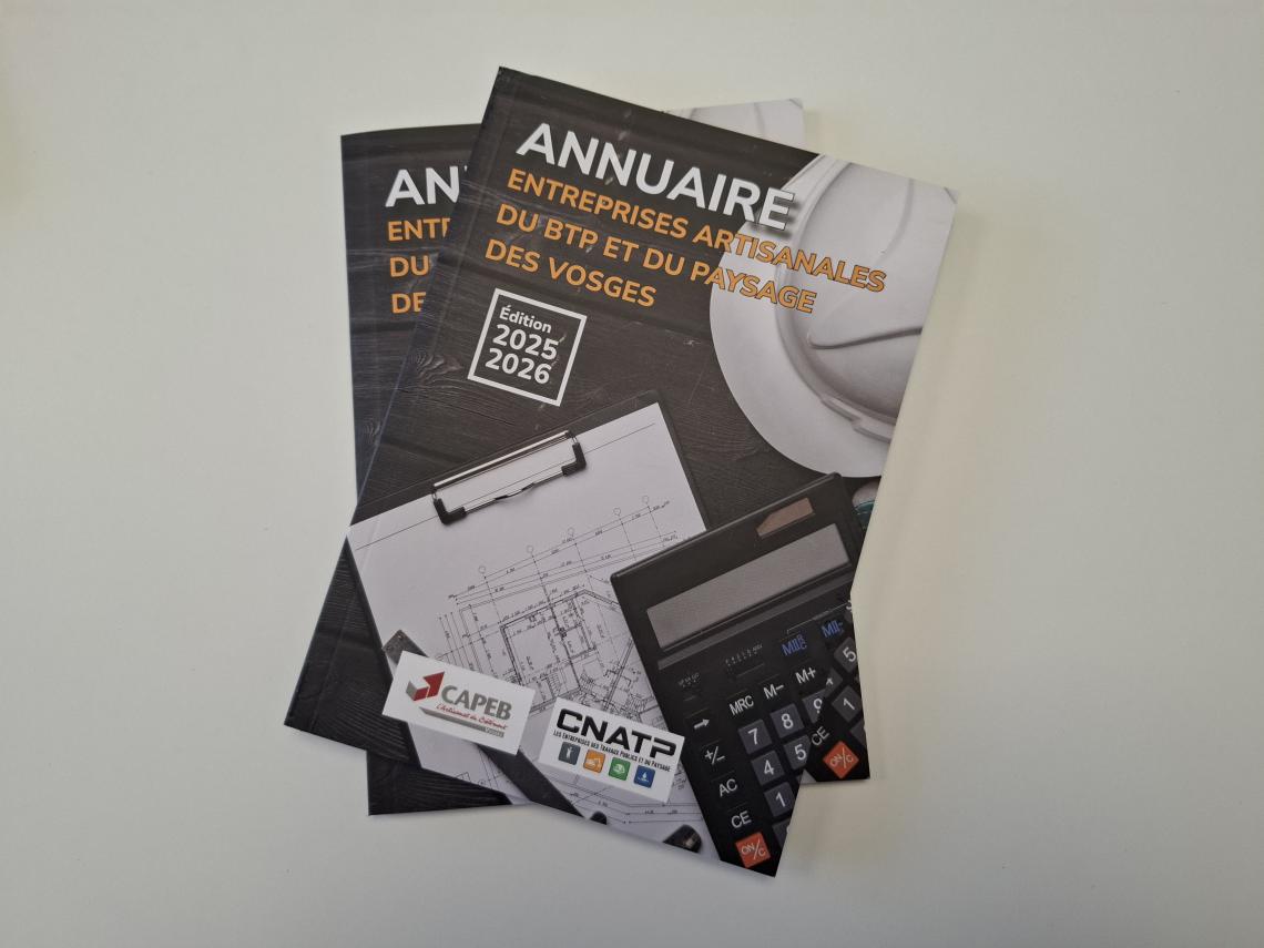 Tous les adhérents de la CAPEB et de la CNATP des Vosges figurent dans cet annuaire. Il est distribué sur les salons (Habitat & Bois, Planète et Énergies,...etc) et disponible dans nos locaux. D’ailleurs si vous en souhaitez des exemplaires ou en mettre dans votre mairie ou encore chez votre boulanger préféré... n’hésitez pas à nous en demander.