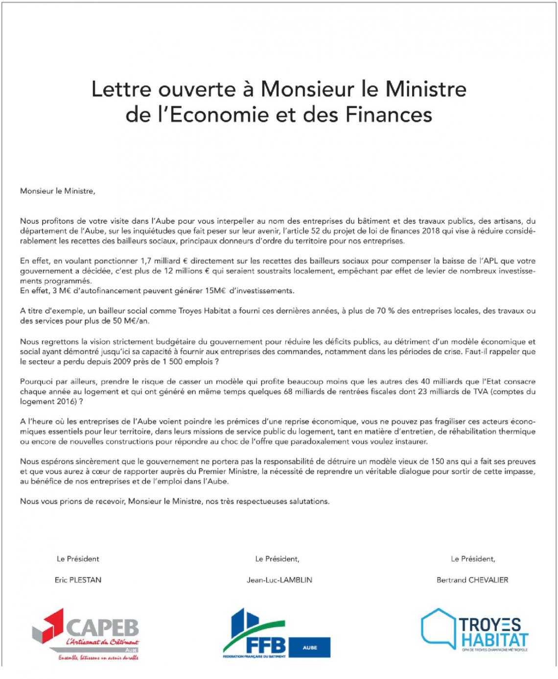 Le 23 novembre, les Bailleurs sociaux et la CAPEB ont remis en mains propres un courrier au Ministre de l'Economie, Bruno Le Maire, de passage sur Troyes.